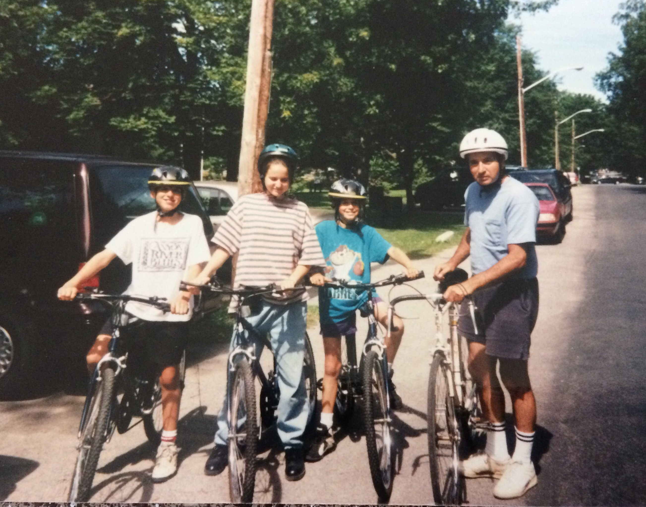 Ready to roll: my brother David, myself, my brother Matthew, and dad (photo of a photo taken before digital)