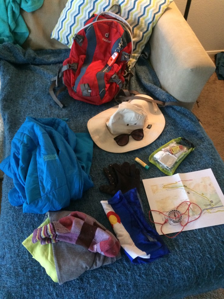 Not pictures but packed: knife, water, snacks, PB&J sammies (official sammy of hiking), hiking pole, selfie stick (ok, not one of the 10 Essentials), yak trax (because I’m not the most graceful person hiking on ice or snow), sunscreen, hiking boots, and tissues (because I’m allergic to the outdoors. Well, some of it. Haha)