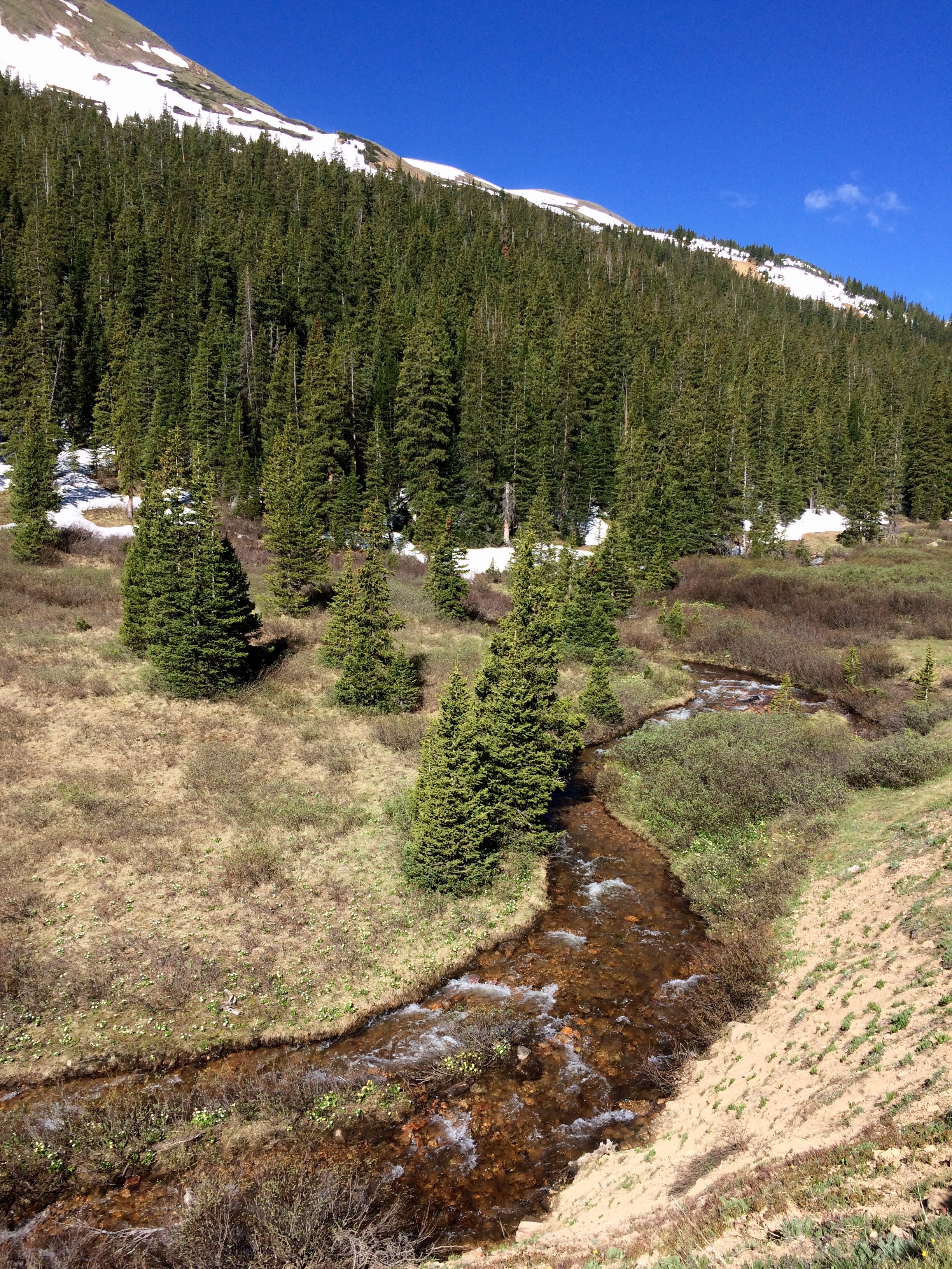 This trail gains about 1,655 feet in elevation and tops out at 12,018 feet.   With slick, snowy patches to navigate and slightly tougher breathing above treeline, I still made it to the lake, just a little later than I anticipated.